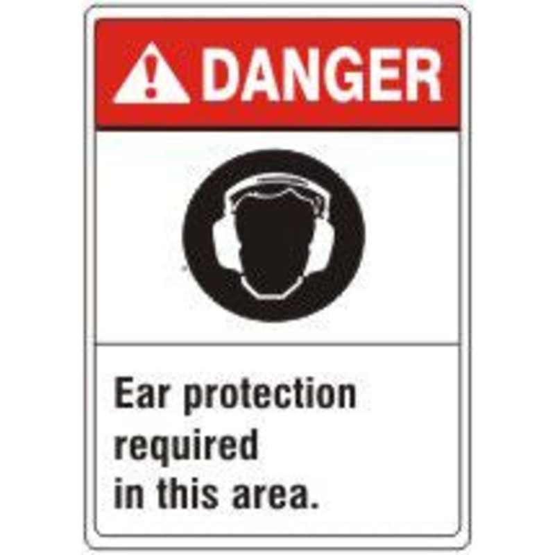 Danger Ear Protection Required In This Area. Label With Ear Protection Picto, Adhesive Vinyl, Red/Black/White, 10x7"