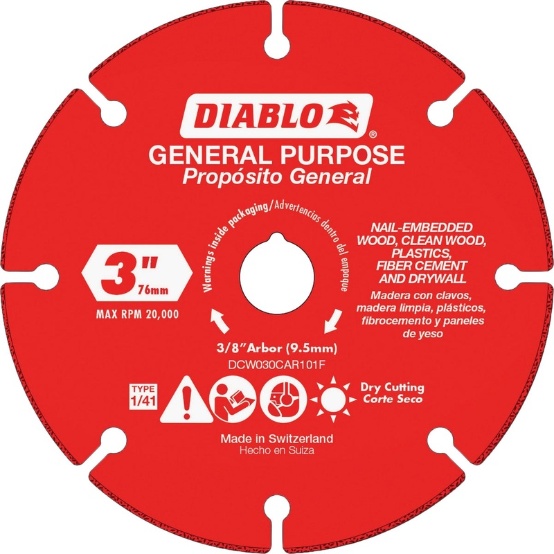 Diablos carbide grit multi-material cut-off wheels features innovative cutting technology for superior performance in a wide range of applications. These cut-off wheels feature a reinforced steel body for a consistent diameter when cutting woods, plastics, fiber cement or drywall. The wheels advanced laser melting process provides a longer lasting and durable carbide edge bond for maximum durability and longer cutting life. Optimized for 3 in. compact saws from manufactures such as: Milwaukee (3/8 arbor; 20,000 RPM), Ryobi (3/8 arbor; 19,000 RPM) and Ridgid (3/8 arbor, 19,500 RPM).