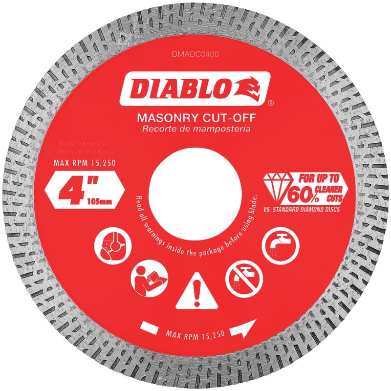 Diablo's diamond continuous rim masonry cut-off discs provide cleaner and precise cuts in granite, marble, porcelain and tile. These diamond rimmed discs deliver up to 60% smoother cuts versus standard diamond cut-off discs. The disc's industrial-grade dia
