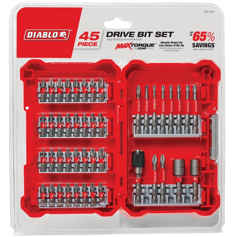 Diablo’s hi-performance screw driving set delivers extreme durability and longer life in the installation and removal of fasteners. The included drive bits have an optimized tip design to provide a strong, precise grip that reduces wear, stripping and slippage. The magnetic nut setters and drive bit holder are designed with a high-strength, permanent magnet for a secure, anti-wobble grip when fastening screws and nuts. Rust protection coating for superior wear and corrosion resistance. Laser engraved for easy identification. Optimized heat treatment process strengthens the nut setter for impact resistance and stability. Torque Resistant Design absorbs torque for less stress at the tip. This set is Impact Strong, delivering increased shank stability and durability in cordless and corded impact and drill drivers. Includes (1) 1 In. #1 Phillips Drive Bit, (7) 1 In. and (3) 2 In. #2 Phillips Drive Bits, (2) 1 In. #2 Phillips Reduced for Drywall Screws Drive Bits, (1) 1 In. #3 Phillips Drive Bit, (1) 1 In. #1 Square Drive Bit, (6) 1 In. and (1) 2 In. #2 Square Drive Bits, (1) 1 In. #3 Square Drive Bit, (1) 1 In. #10 Torx Drive Bit, (1) 1 In. and (1) 2 In. #15 Torx Drive Bits, (4) 1 In. and (2) 2 In. #20 Torx Drive Bits, (4) 1 In. and (2) 2 In. #25 Torx Drive Bits, (1) 1 In. #27 Torx Drive Bit, (1) 1 In. #30 Torx Drive Bit, (1) 1 In. #40 Torx Drive Bit, (1) 2 In. #30 Torx Drive Bit, (1) 2-3/8 In. Quick-Change Magnetic Drive Bit Holder, (1) 5/16 In. x 1-7/8 In. Magnetic Nut Setter, (1) 1/4 In. x 1-7/8 In. Magnetic Nut Setter.