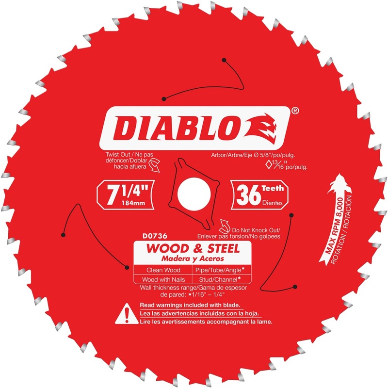 Diablo's innovative Carbide Saw Blade for Wood and Metal is the industry's first multi-purpose saw blade for cutting clean wood and wood with nails, up to 2" material thickness; and metal ranging from 3/32"-1/4" wall thickness and 1/4"-1" diameter. The ver
