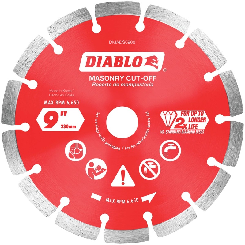 Diablo's diamond segmented masonry cut-off discs provide extreme durability and longer life in concrete, concrete with rebar, brick and cinder block. These diamond rimmed discs deliver up to 2X longer cutting life versus standard diamond cut-off discs. The