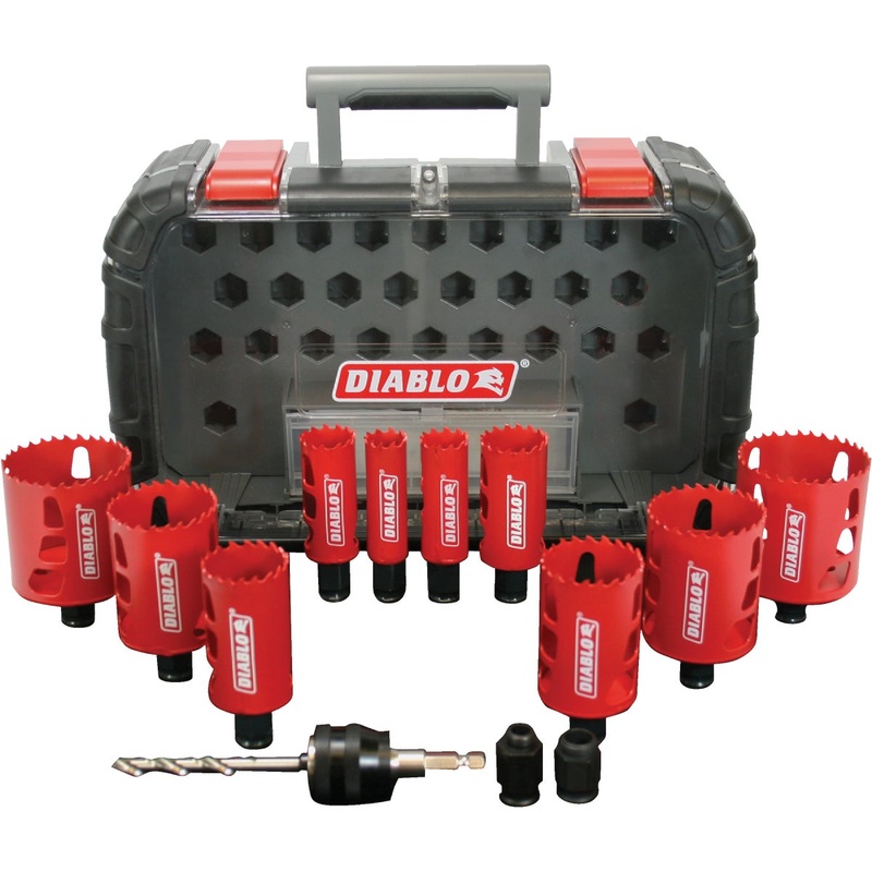 Diablo 14-piece hole saw kit features 10 bi-metal hole saw cups and 4-piece Snap-Lock Plus mandrel system for quick and easy hole saw changes for maximum job performance. These new hole saws provide ultimate cutting length of 2-3/8 In. to bore deeper holes in a single pass. Features Variable Tooth Design for faster cuts. Universal Snap-Lock Plus mandrel system fits all hole saws in the range, including carbide tipped hole saws. Tool-free plug ejection for fast material removal. For use with wood and metal. Sizes include: 7/8 In., 1 In., 1-1/8 In., 1-3/8 In., 1-1/2 In., 1-3/4 In., 2 In., 2-1/8 In., 2-1/2 In., 2-9/16 In., Snap-Lock Plus mandrel, pilot bit, adapter nuts.