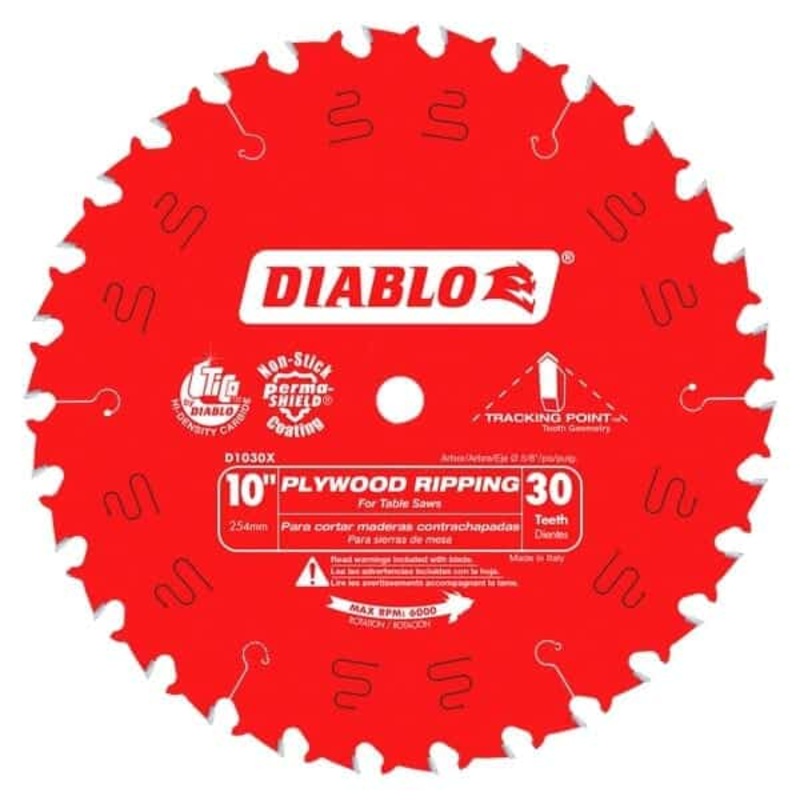 DescriptionDiablos D1030X 10 in. 30-Tooth Plywood Ripping Saw blade features the exclusive Tracking Point tooth design and enhanced anti-vibration design for superior cutting performance in plywood ripping applications. Sheathing walls and roofs just got e