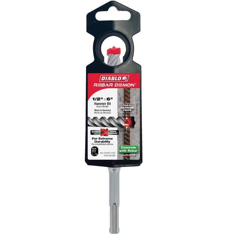 Diablos revolutionary, most complete range of SDS-Plus and SDS-Max Rebar Demon 4-cutter full-carbide head hammer drill bits are the only bits designed to be the most durable, fastest and coolest solutions on the market. The Rebar Demon bits feature up to 2