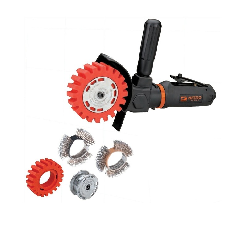 NitroZip Surface Conditioning/Decal Pinstrip Removal Tool .5 hp Right Angle 3500 RPM Rear ExhaustUsing the Dynabrade Nitro Series NitroZip Surface Preparation Tool equipped with a wire wheel allows technicians to remove rust and seam sealers in preparation