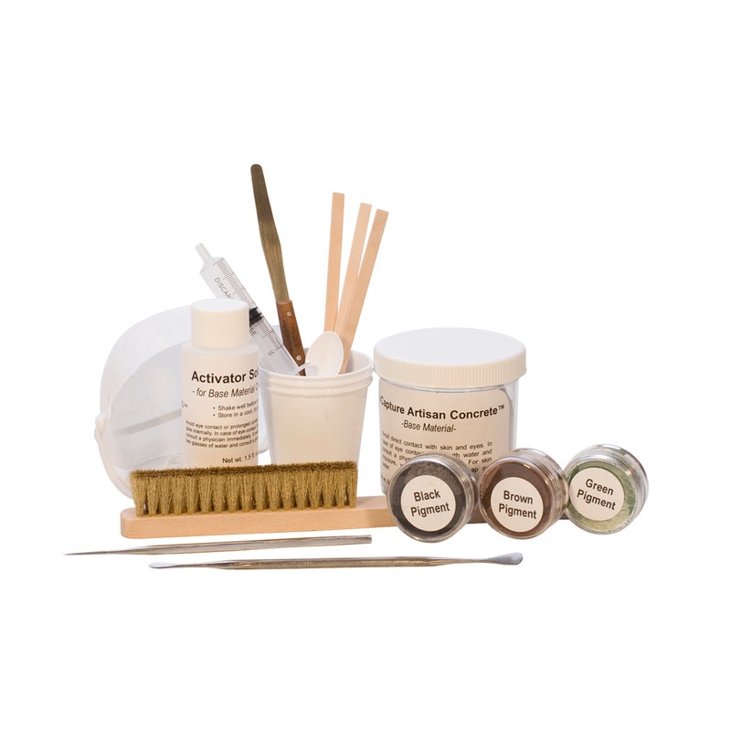 Items Included: EnCapture Concrete Base Material – EnCapture Activator – Disposable Mixing Cups – Palette Knife – Wooden Mixing Sticks – Syringe for Measuring Activator – Dust Mask – Disposable Gloves – Brass Brush – Straight Carver – Double-Ended Carver – Colored Powder Pigments – and a Measuring Spoon for Pigment.