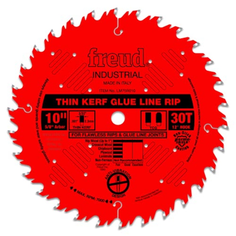10″ x 30T Industrial Thin Kerf Glue Line Ripping Blade Freud’s new thin kerf glue line rip saw blade. This blade’s specifically designed triple chip tooth produces extremely smooth true surfaces for gluing and finish work. There is no need for sanding or jointing after the cut. The ideal working range is from 1/8-Inch to 1-Inch thick. With this ultimate ripping blade, there is no need for stabilizers. Blade features Freud’s Tico Hi-Density micro grain carbide with Titanium for long life and a flawless finish, Laser-cut anti-vibration Technology reduces noise and extends cutting life, Laser Cut steel blade body for smoother cuts and flatness, and Non-stick Perma-Shield Coating that reduces gumming, rusting, and corrosion for longer life with less wear. The thin kerf blade removes less material than standard carbide blades, thus requiring less horsepower to produce equally good results. 10-Inch by 30t TCG 5/8-Inch arbor. This blade is covered by Freud’s Limited Lifetime Guarantee.