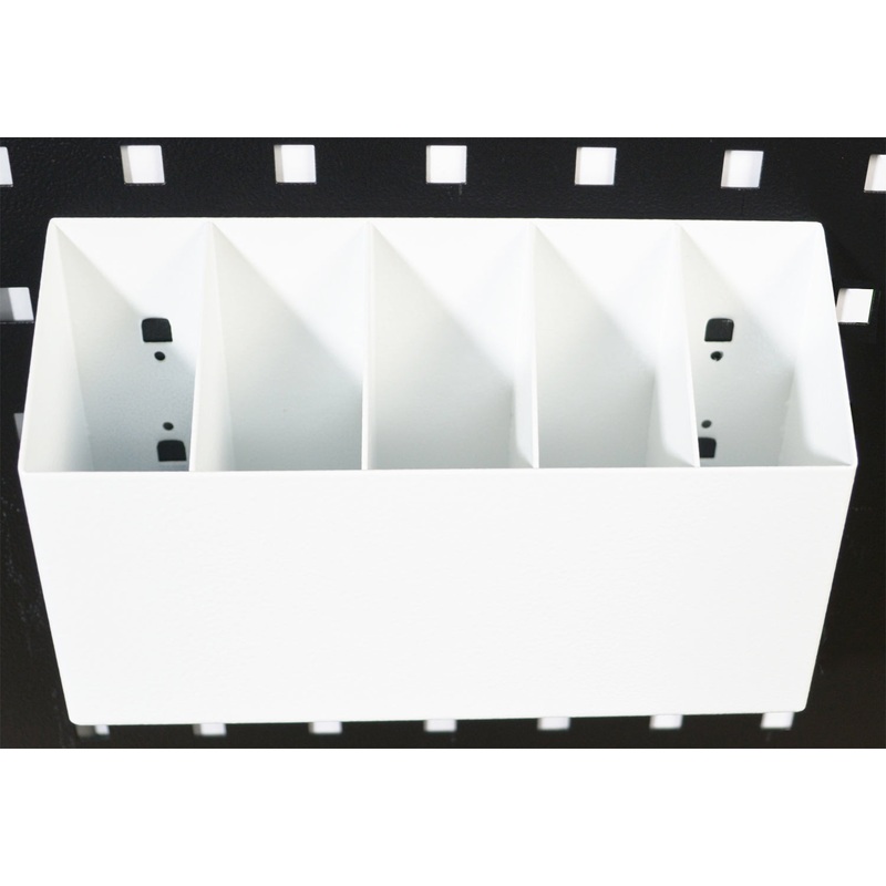 Designed with 5 compartments (approximately 1-1/2" wide, each) for holding small jewelry making tools such as files, burs, sawblades, beading tools, and more. Attaches to the pegboard design of the GK Smart Bench. Measures: 8" long x 5" high (at the talles
