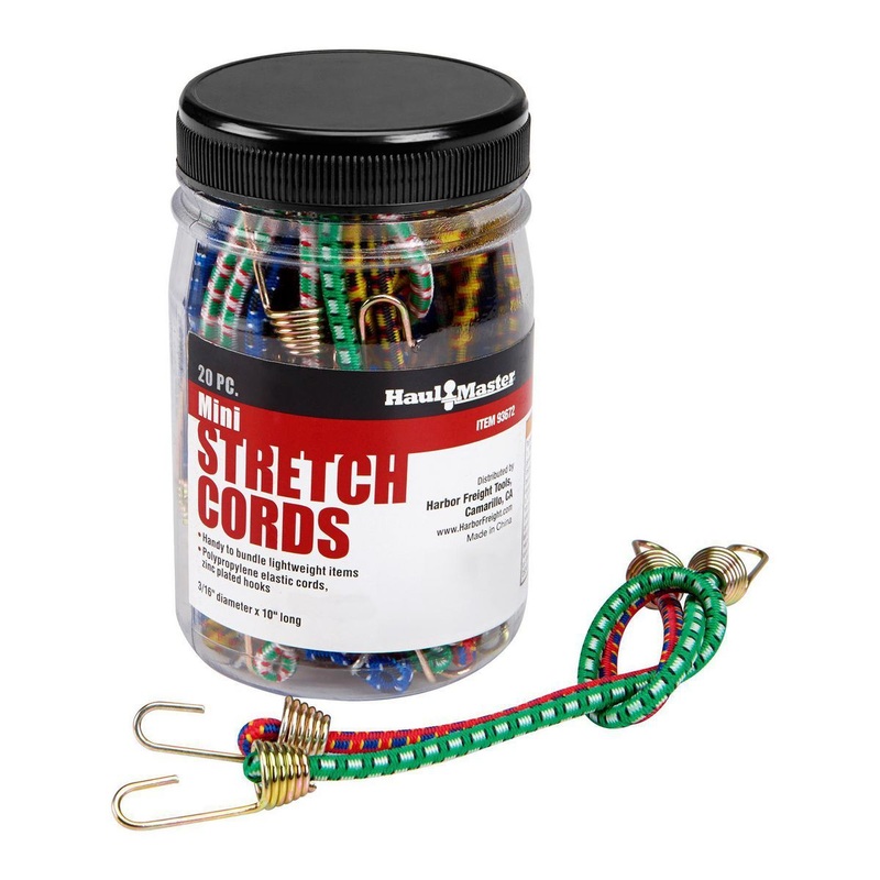 These polypropylene elastic stretch cords are very useful when you need to tie down or bundle small objects. These handy stretch cords are lightweight and maintain their elasticity. The steel hooks are zinc-plated to resist rust and corrosion.