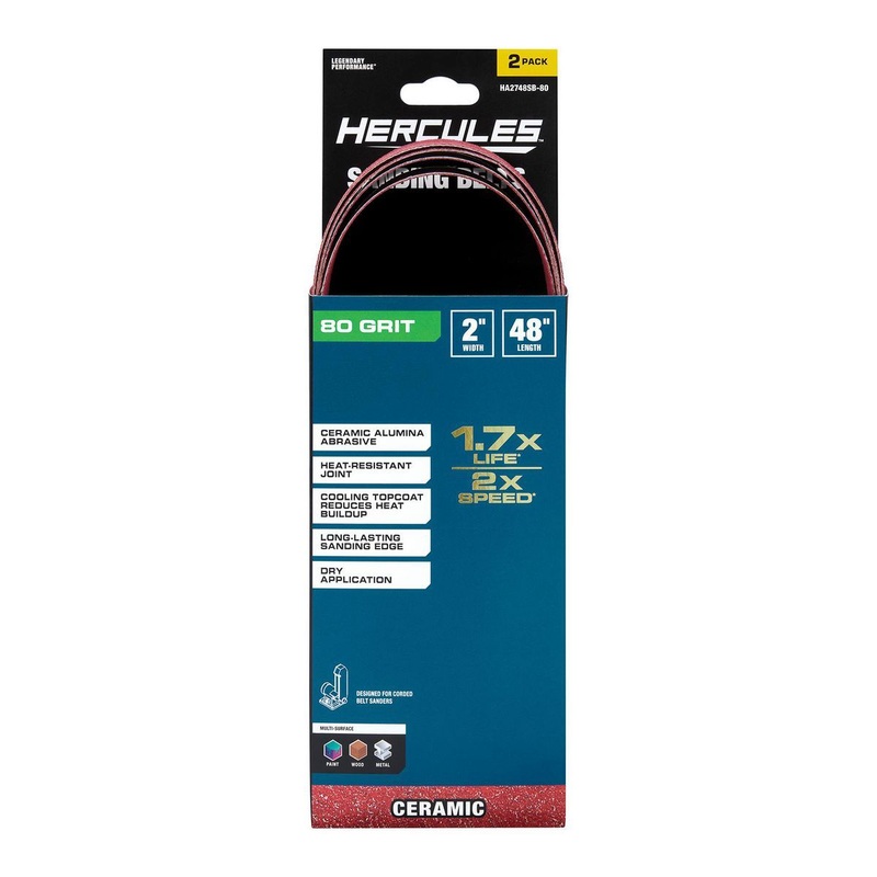 These HERCULES Sanding Belts are made with a premium Ceramic Alumina grain that works 2X faster* and lasts 1.7X longer* for fast material removal on paint, wood, and metal. Use these sanding belts with 2 in. x 48 in. corded belt sanders.Premium Ceramic Alu