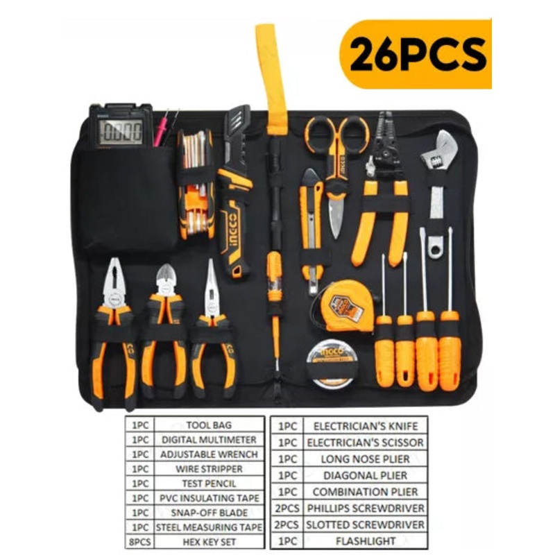 Ingco HKETS0261 26pcs Electricians Tool Kit Set26Pcs Electricians Tools SetSpecial designed for electrical detection and repairInclude:1 Pcs Digital Multimeter Alkaline battery included1 Pcs 6" adjustable wrench1 Pcs 6" long nose plier1 Pcs 6" Diagonal cut