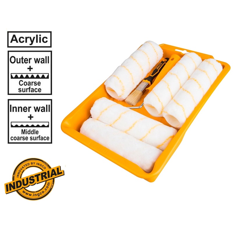 Ingco HKTCB83230083 8 in 1 Cylinder Paint Roller with Tray Set 9"Suitable for inner wall and outer wall1pcs 230mm 9" 7mm roller cover3pcs 230mm 9" 12mm roller cover1pcs 230mm 9" 18mm roller cover1pcs 230mm 9" cylinder brush bracket1pcs 25mm 1" unique desig