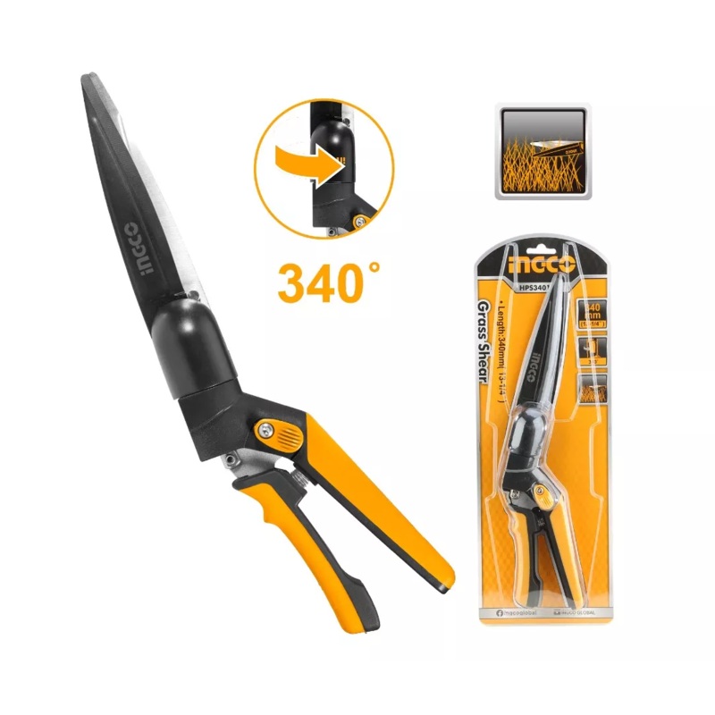 Ingco HPS3401 Grass Scissors / Garden Shears 340mmSize:13-1/4""/340mmBlade size:7""/180mmNet weight:315gHeat treatment w/non stick coatingABS handle with TPR gripPacked by sliding card