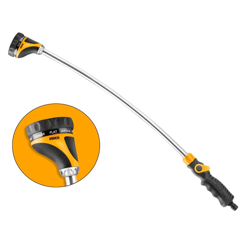 Ingco HWW092 Water Wand Garden Nozzle Sprayer (9-Way)Same as STANLEY quality levelAdjusetable angle,powder-coated metal head9-spray patterns for all wateringneeds:mist,soaker,flat,vertical,shower,cone,fan,center,jetTPR insulated comfort grip"U" style ON/OF