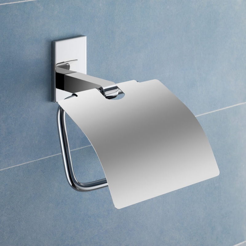 Sporting a very modern look, this wall mounted toilet paper holder features a matte finished swiveling cover. Made of solid brass and finished in chrome, this toilet roll holder will resist corrosion, last for years, keep its handsome looks and nicely comp