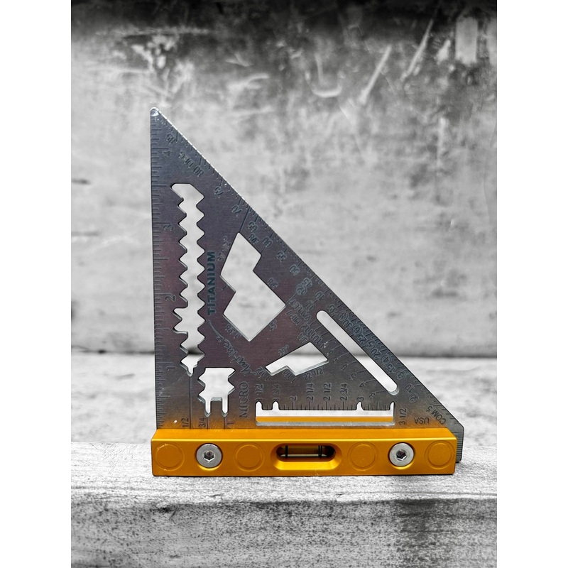 Built from Grade 5 aerospace titanium, paired with a removable 6000 series aluminum heel and integrated level bubble, this tool delivers customizable precision that adapts to your workflow. Every edge is CNC-machined. Every mark laser-scribed. Every square proudly made in the USA.