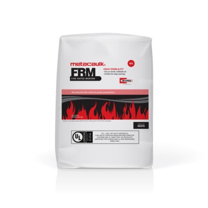 A fire rated load bearing mortar to economically firestop large openings for through-penetrations in fire-rated walls and floors. Can use with power cables, fiber optic telephone cables.Metacaulk Fire Rated Mortar is a rapid-hardening gypsum/cement compoun