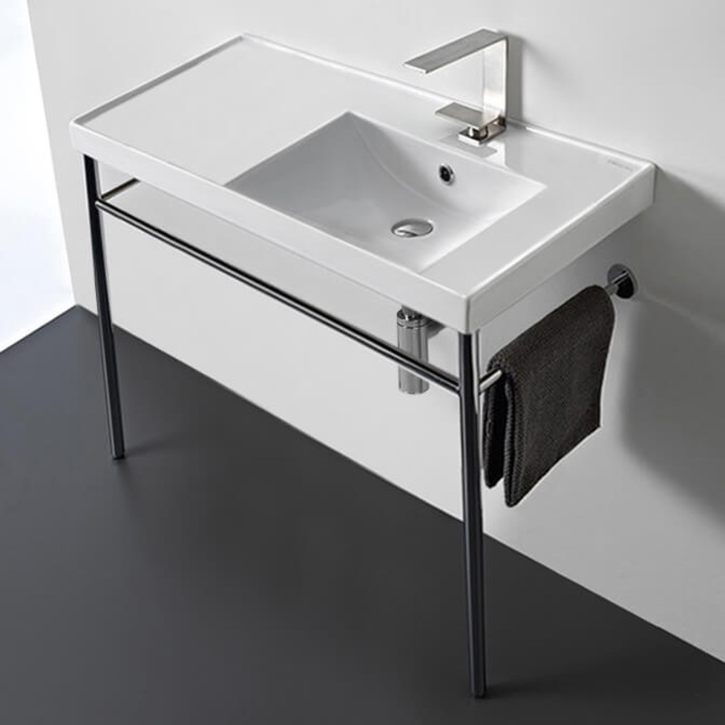 Perfect for the modern or contemporary bathroom atmosphere, this 36 inch bathroom console is made from built-to-last white ceramic. It comes in the one hole, three hole or no hole option. It comes complete with polished chrome legs made from brass. It was made in Italy by Scarabeo as part of their ML collection. Ceramic sink is US and Canada standards approved (IAPMO, UPC/cUPC, ASME A112.19.2-2018/CSA B45.1-18).