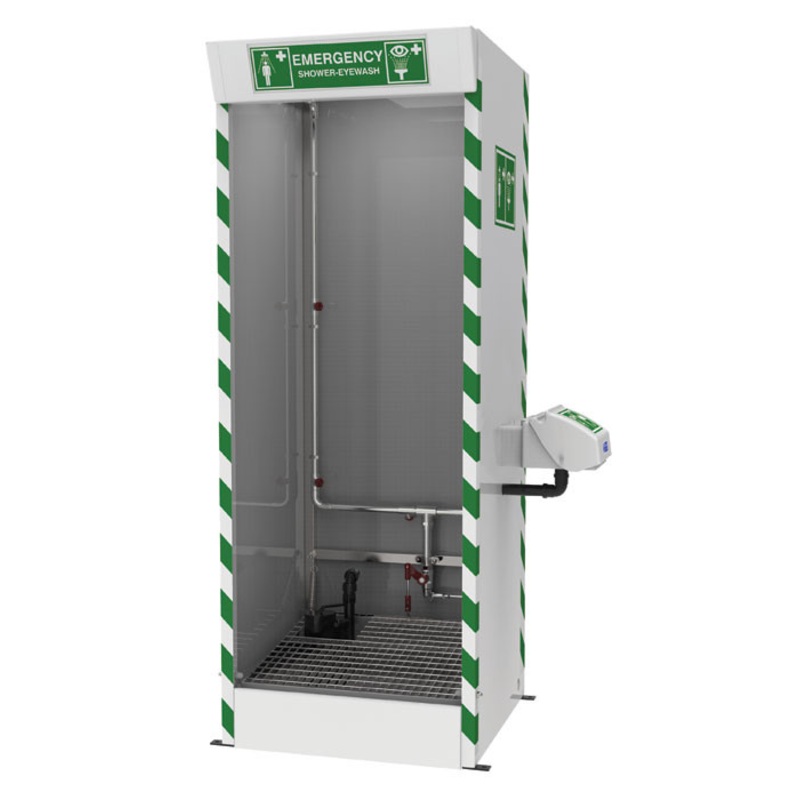 Designed for locations where space is at a premium or the emergency safety shower needs to be enclosed, this multi-nozzle decontamination cubicle shower helps prevent overspray and is activated by foot panel upon entry. The cubicle shower has a stainless steel hollow section frame enclosed in GRP sheeting with stainless steel pipes for corrosion resistance and extended life. The exterior sheeting includes universal pictogram signs and green and white safety stripes. Sump pump incorporates an integral float switch, which provides automatic pump control in the form of a low level cut out to prevent the risk of running dry120V, 60 Hz suitable for general purpose areas.