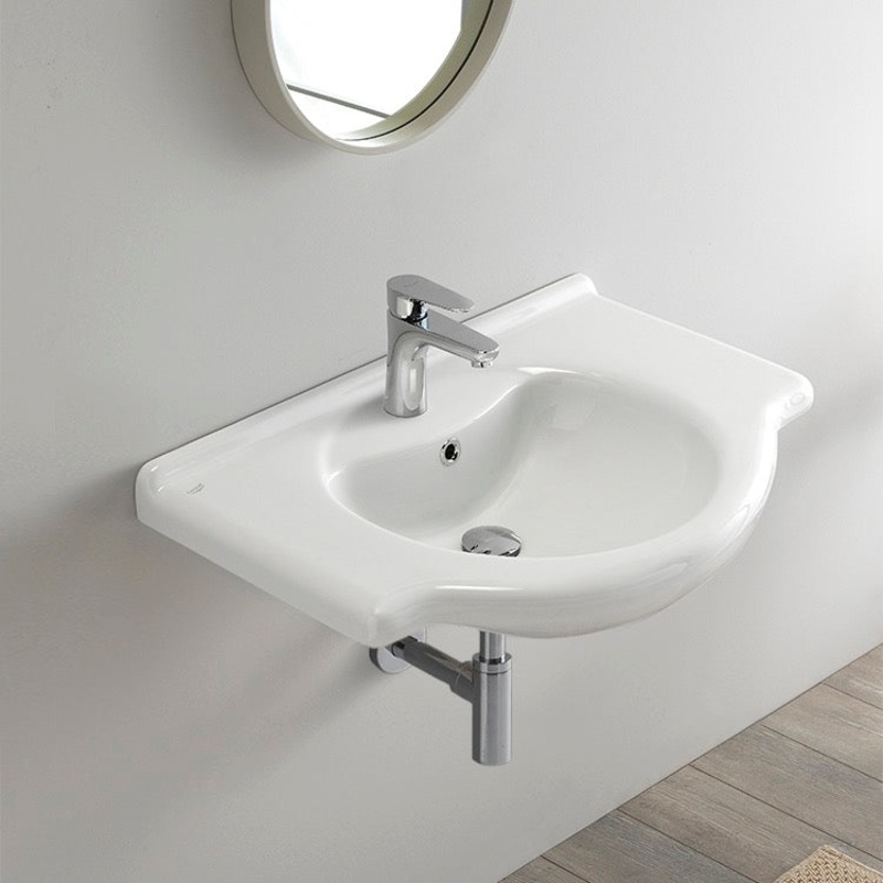 This classically styled 25.6" inch long wall mounted or self rimming bathroom sink comes with a single faucet hole and an included overflow. Its small, traditional design is made out of high quality ceramic with a white finish.Curved rectangular white cera
