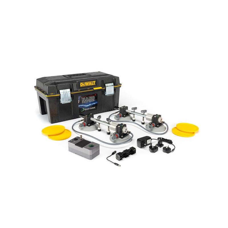 VERSATILE, COMPACT SEAM SETTER The Nano Stealth Seamer, Auto joins and levels glass and stone to consistently create high-quality, even seams with more control and less effort than traditional methods. The products proprietary non-marking cups feature our FTS (Flexible Triple Seal) technology that locks-in vacuum and provides optimum holdeven on textured and leathered materials. The Nanos wide-open design and high-clearance driveshaft keep seams extremely accessible for epoxy application and removalno need to waste time scraping the seam after glue has set. 5 vacuum cups allow working with smaller pieces such as backsplashes, or in tighter spaces around sinks and other cutouts. Sold in pairs with a convenient storage case; recommended for porous and non-porous materials. HIGHLIGHTS Consistently create high-quality, even seams 5 cups allow seaming smaller pieces and tighter spaces More control and less effort than shims and screws Non-marking, proprietary synthetic* rubber cups are highly-durable and feature FTS technology for optimum hold, even on textured materials FTS vacuum cup technology for optimum hold on textured and leathered materials Easily access seams for epoxy application and removal Non-spinning leveling feet wont scratch surfaces Smooth-turning knurled roller opens and closes seams with ease Powerful, compact pump maintains max pressure for entire system Runs on AC power or AA batteries for any situation