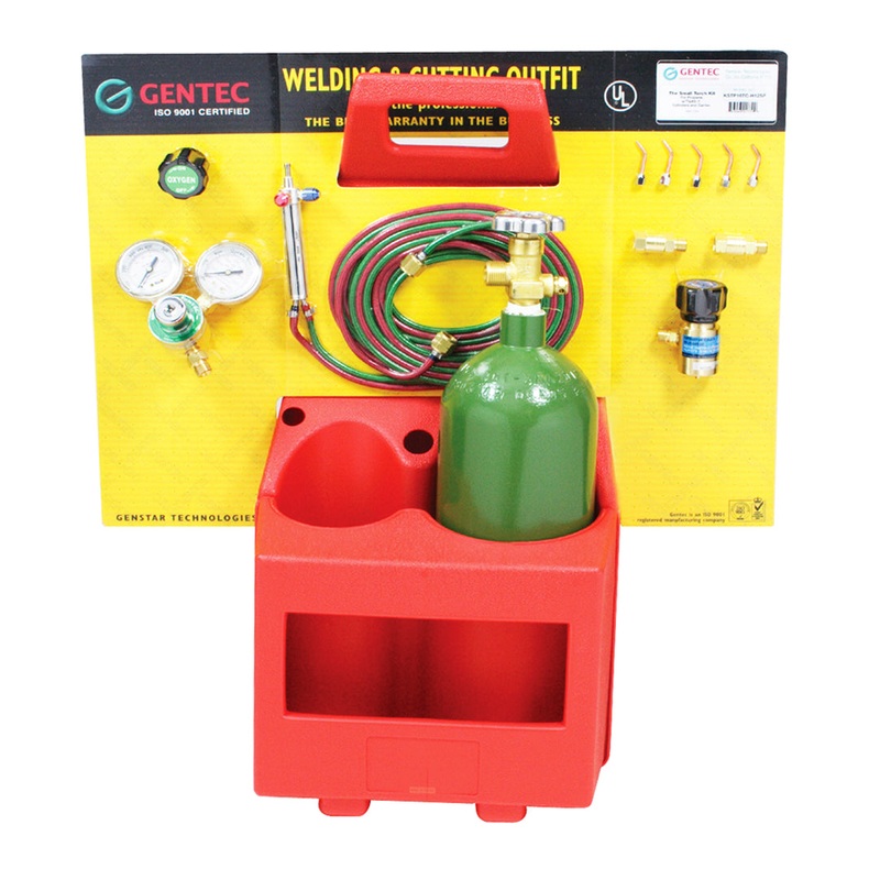 This deluxe set includes a torch handle, hoses, regulators, tanks, and #3, #4, #5, #6, and #7 tips all within a handy plastic carrying caddy. Oxygen Propane Kit is for use with disposable tanks; comes with oxygen tank only. Tanks shipped empty; all caddy kits come with check valves.