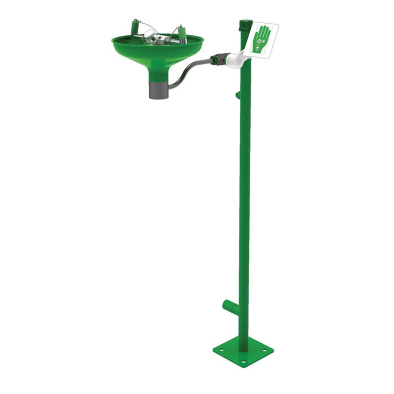 Ideal for laboratories, schools and general light duty indoor use, this pedestal mounted eye/face wash unit meets ANSI Z358.1 and EN 15154 standards, and supports OSHA requirements. Pop-off dust covers protect the twin spray nozzles from contaminants, and are lifted off by the water jets upon operation via the push plate. Includes an inspection record tag for recording test and service history.