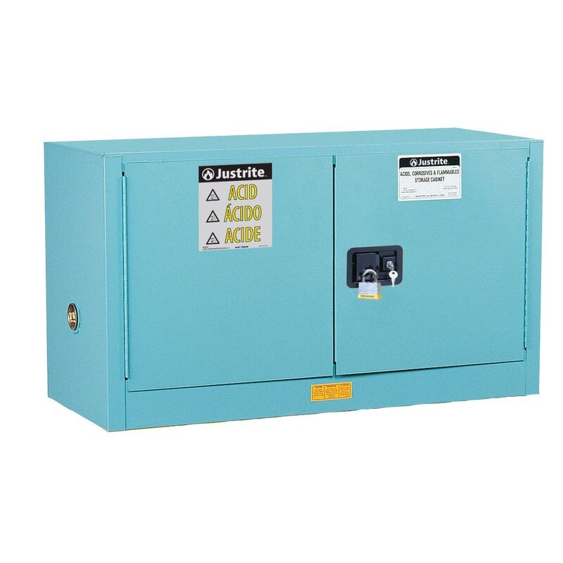 Justrite blue steel Piggyback safety cabinets for corrosives have the same quality safety features as the cabinets for flammables. All models come with double-wall construction, dual vents, grounding wire connections, adjustable shelves, leakproof sills, three-point self-latching doors and leveling feet. Self-close door(s) shuts and latches automatically when a fusible link melts at 165F (74C) under fire conditions. Unique, concealed self-closing mechanism offers obstruction-free access to contents.