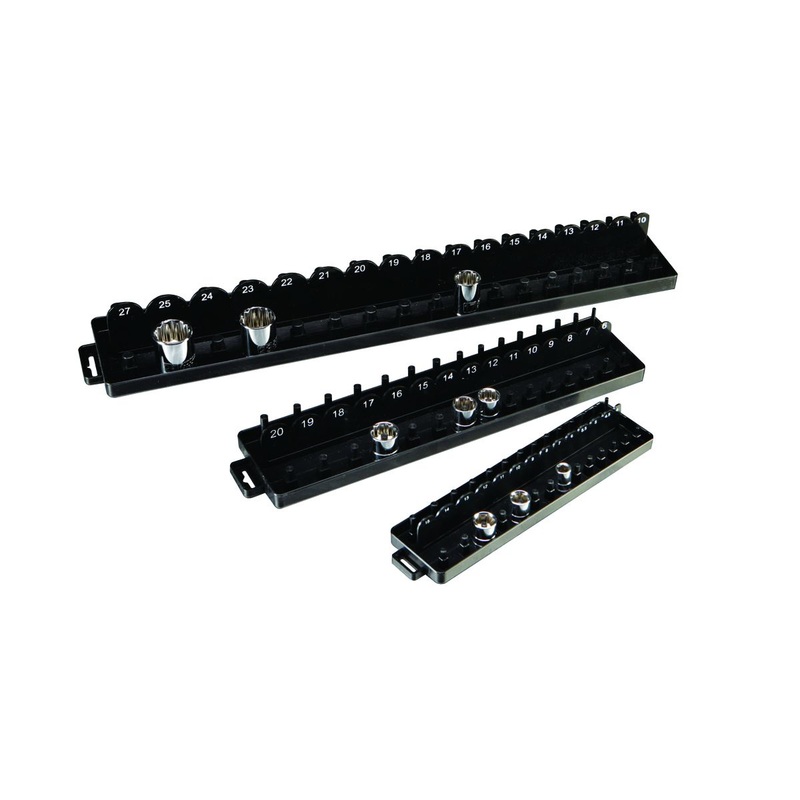 This socket organizer set fits neatly in your tool chest or can be mounted to your wall or pegboard to organize your sockets for quick and easy identification. The socket organizer fits most socket designs and holds both regular and deep sockets. Trays for 1/4 in., 3/8 in. and 1/2 in. drives are included.