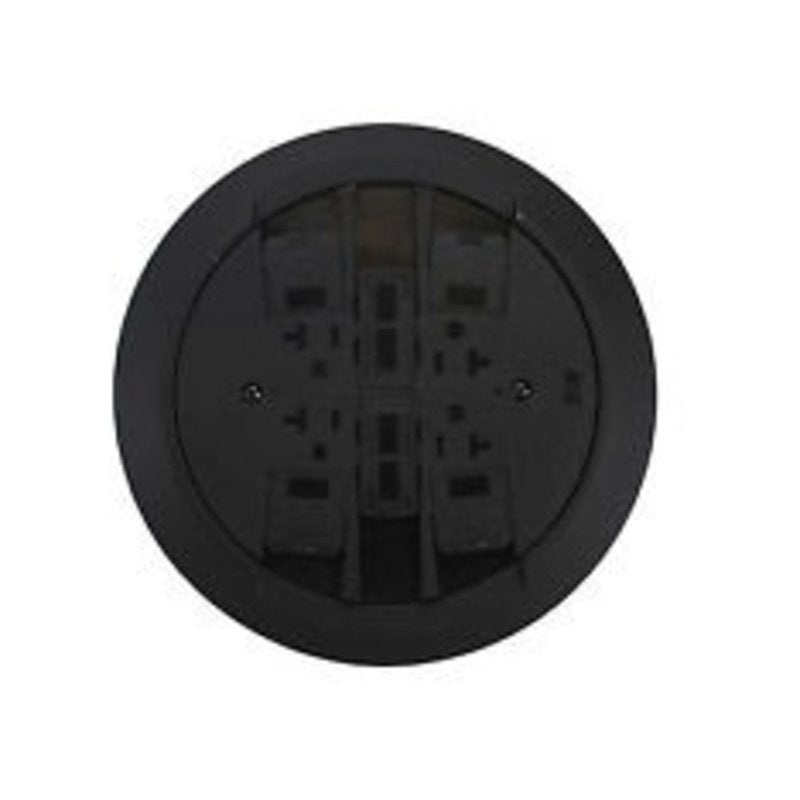 Poke-Thru Device, Flush, Assembled Unit, Non-Metallic Cover, Color: Black. Diameter: 8-1/4". Depth: 9-1/16". Includes: Duplex Receptacle (20 Amp, 125 Volt, NEMA 5-20R, 2P, 3W, Straight Blade), (1) Ortronics TracJack Mounting Bezel & (1) Ortronics Series I,