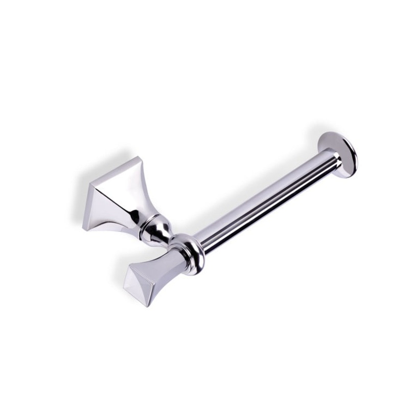 A prism shaped accent on this classically styled wall mounted toilet tissue holder makes this a great choice for your bathroom dcor. Forged in solid brass and available in two finishes: Chrome or Brushed Nickel you can expect this handsome toilet paper holder to last and last while looking good.