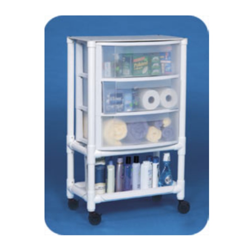 Pvc hospital certified nursing aide cart w/casters. This model comes 3 large storage drawers. Cart size: 42"h x 26.25"w x 15.5"d. Nursing cart is fully fda compliant. Constructed from the toughest pvc on the market. Light weight to make handling and moving