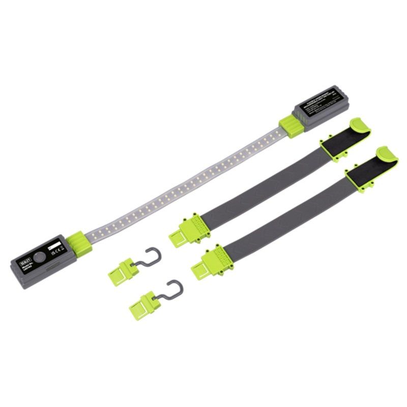 Super bright 10W COB LED produces up to 1600 lumens with a wide spread of light, illuminating the whole work area. Includes interchangeable hooks, one set of short hooks with 360 of rotation and silicone bands with foam covered hooks to prevent damage to paintwork. Silicone bands stretch from 1.35-1.7m. Light band is bendable to best position light in any situation. Includes an additional 150 of rotation at either side of the band. Both sides of the light band feature covered magnets that allow the light to be attached to a bonnet without the detachable silicone hooks or rotating hooks. Two 3.7V 2Ah lithium-ion batteries for extended battery life with a long runtime of 3.5hrs at 1600lm. Easy-to-read charge indicator displays the battery level during use and while charging. Charges via a USB Type-C cable (supplied).