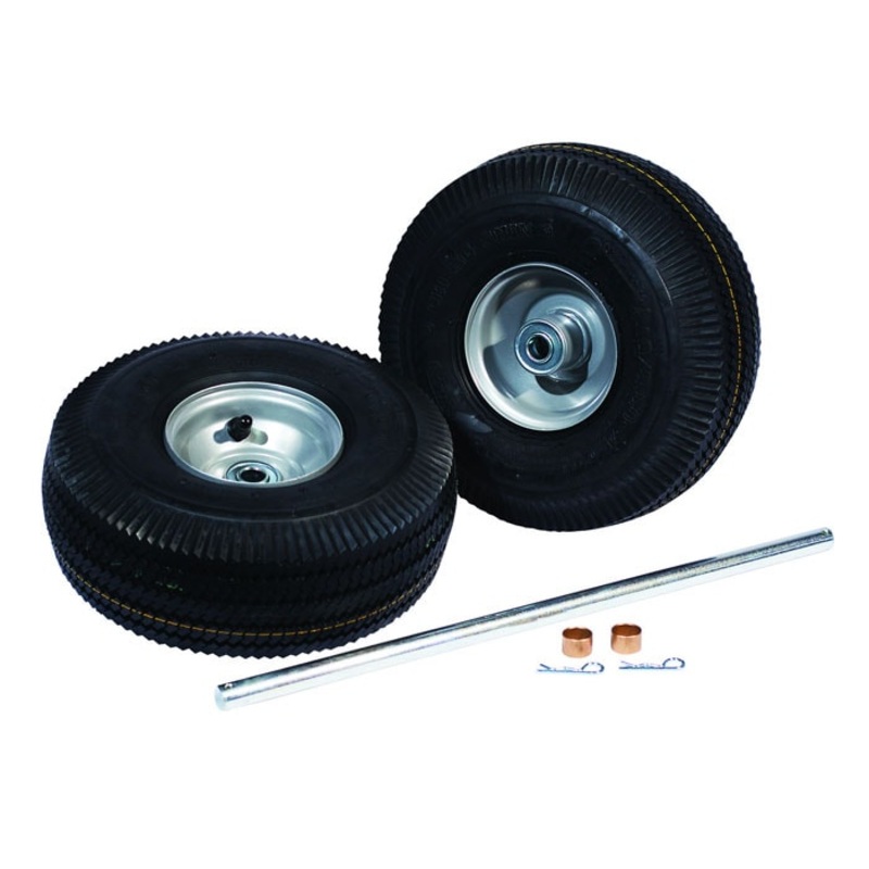 Wheel and axle replacement set for single cylinder Justrite hand trucks. Includes two 10.5-inch pneumatic wheels with welded steel hubs and dual ball bearings, and plated axle with clips and washers. Wheels are 10.5-inch x 4-inch. Axle size is 17.75-inch x 0.625-inch.