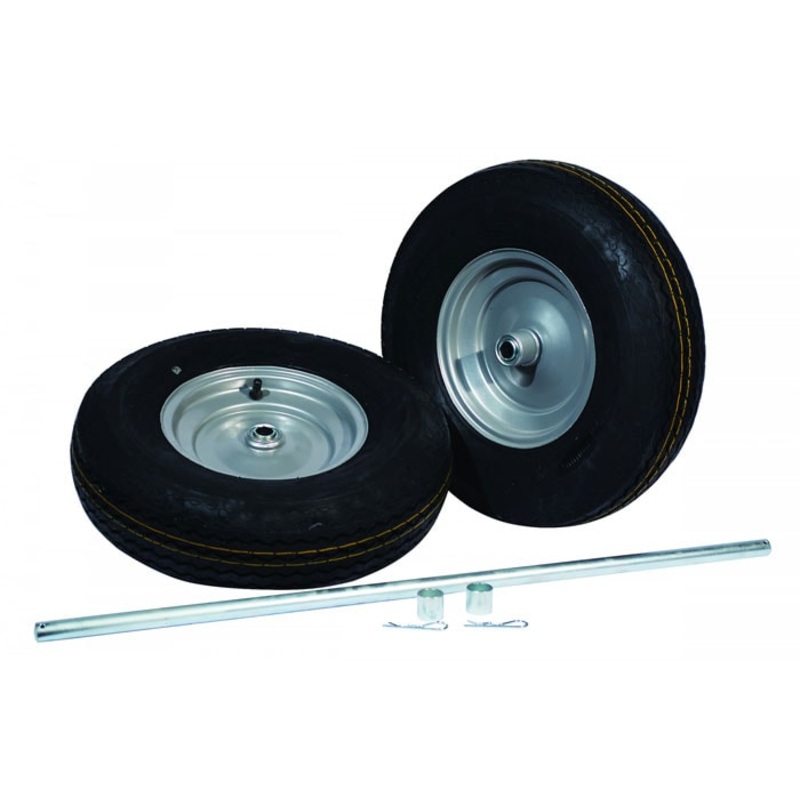 Wheel and axle replacement set for double cylinder Justrite hand trucks. Includes two speed-rated 16-inch pneumatic wheels with four-ply HD construction, welded steel hubs and dual ball bearings, and plated axle with clips and washers. Wheels are 16-inch x 6-inch. Axle size is 31.75-inch x 0.75-inch.
