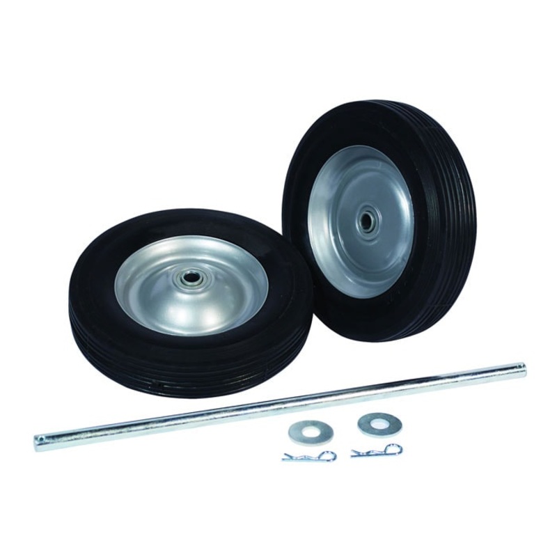 Wheel and axle replacement set for single cylinder Justrite hand trucks. Includes two 8-inch semi-pneumatic wheels with welded steel hubs and dual ball bearings, and plated axle with clips and washers. Wheels are 8-inch x 1.75-inch. Axle size is 15.75-inch