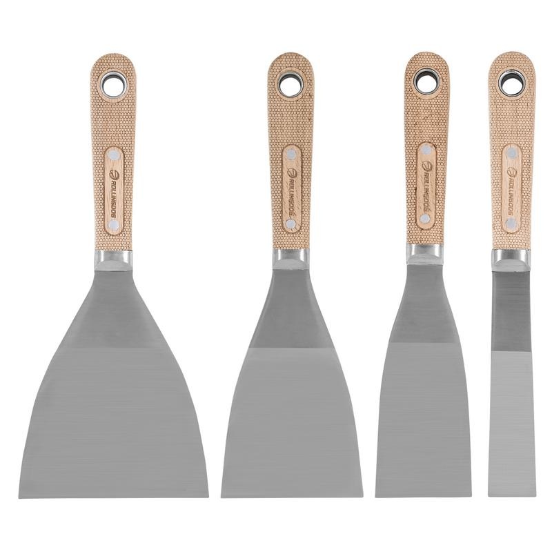 This putty knife set from Rollingdog features flexible stainless steel blades for effective surface preparation. Each knife has a sturdy beechwood handle with a laser engraved pattern for enhanced grip, along with a hang hole for convenient storage. The se
