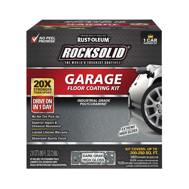 Rust-Oleum RockSolid Polycuramine Garage Floor Kit Modern Greige offer unsurpassed durability, easy maintenance and a fantastic-looking lifetime performance. Unique coating resists salt, oil, gas and other harsh chemicals, making it one of the toughest floor coatings available. RockSolid works great on workshop floors, garage floors and other interior concrete surfaces. Offers quick return to use with ability to walk on in 8-10 hours and drive on in 24 hours.
