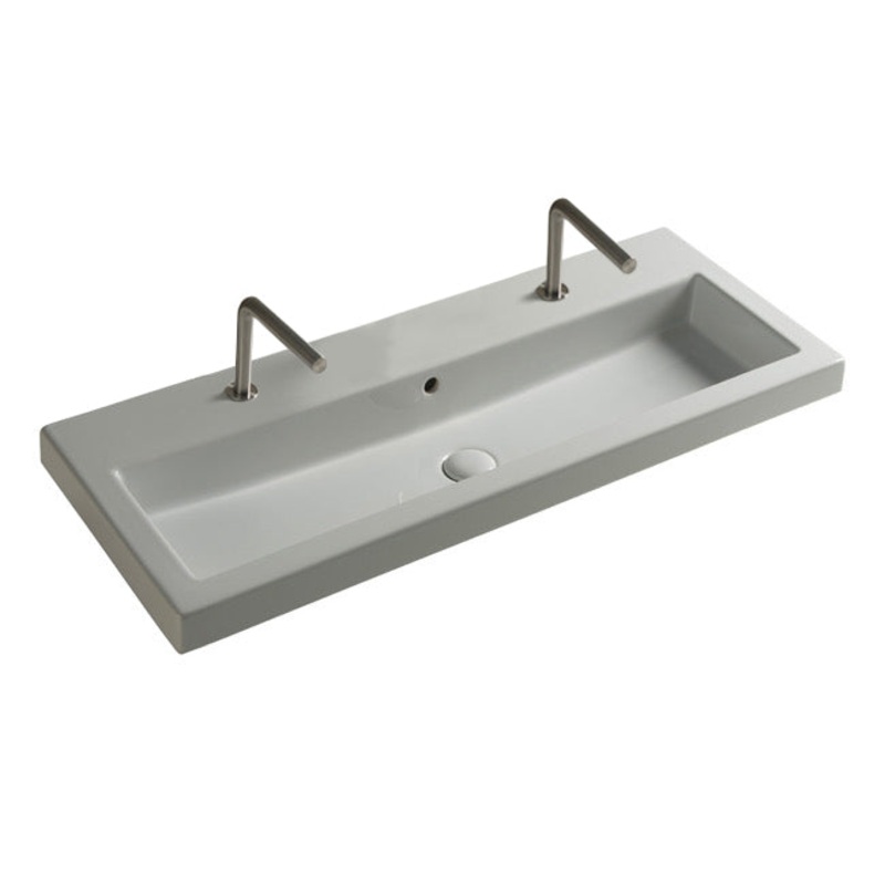 Crafted out of beautiful white ceramic with a beautiful white glaze finish, this rectangular sink comes as either a wall mounted model or as a self rimming sink. With included overflow and a double faucet hole design, this sink provides the perfect addition to your contemporary or modern style bathroom.