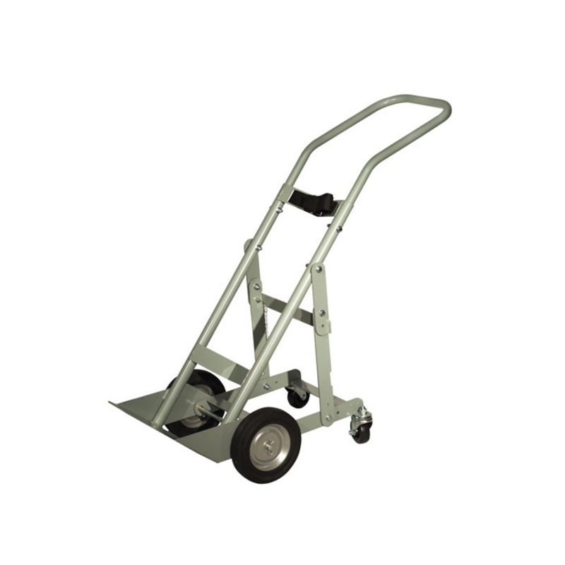 Heavy-duty, 11-gauge (3-mm) floor plate with safety fins prevent warping or breaking. Features unique zero-lift height loading, allowing floor plate to lay flat, thereby eliminating the need to lift cylinder during loading and unloading. Caster carriage features heavy steel bars and nylon washers for smooth folding action and easy storage in tight spaces. Corrosion-resistant powder-coat finish throughout for long life and smooth handling. Upper handle sections bolt in place for reduced package size in order to save on freight costs.