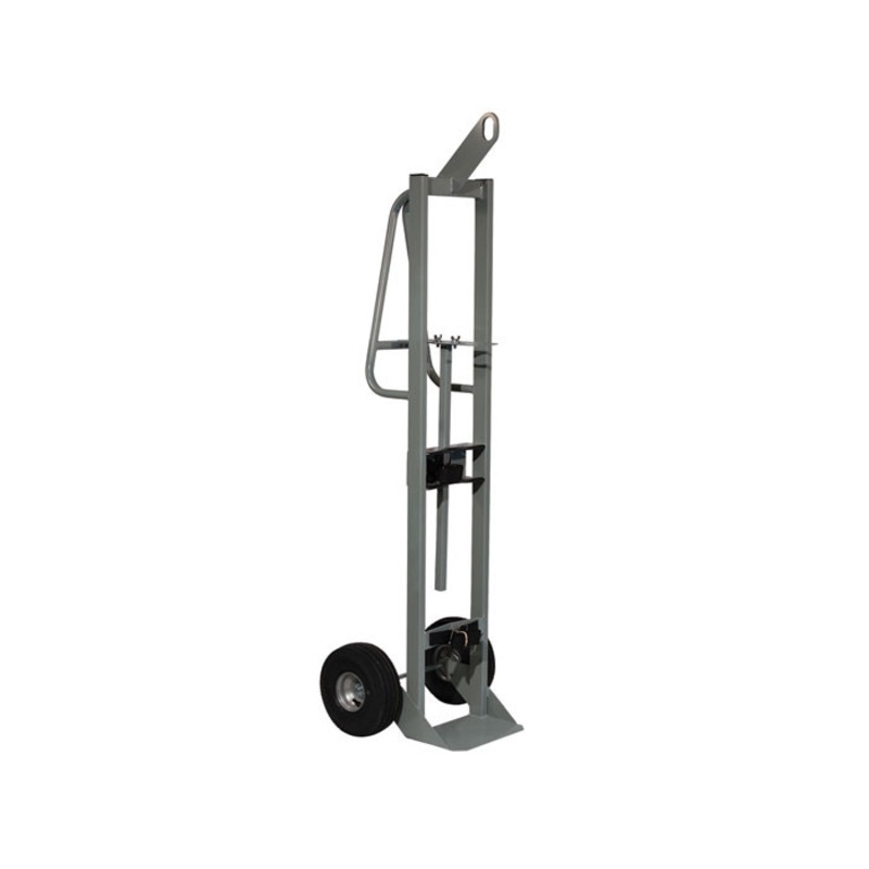 Move gas cylinders easily around a construction site, into locations with poor accessibility, or from floor to floor with these hoist-equipped hand trucks. Designed for one cylinder up to 12-in (305-mm) in diameter. Fully welded construction using 1.25-in (32-mm) diameter round steel tube, these durable cylinder hand trucks provide optimum safety, strength, and longevity. Floor plate made of thick 11-gauge (3-mm) steel with safety fins prevents warping or breaking. Extensive structural framing with 0.375-in (10-mm) thick hoist plates make these units safe when lifted by hoist rigs. Triple grip handle design helps user control the high center of gravity by expanding available grip area for improved leverage and swing radius. The zero-lift height loading allows floor plate to lay flat, thereby eliminating the need to lift cylinder during loading and unloading. Corrosion-resistant powder-coat finish throughout for long life and smooth handling.
