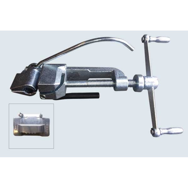 Featuring a built-in cutter and a sliding block assembly. Operates on band widths 3/4, 1, and 1-1/4 and thickness of 0.044.