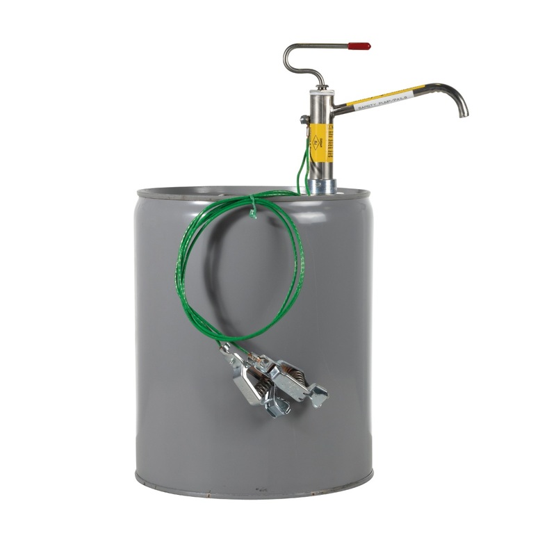 Included with the pump are threaded adapters to fit a variety of pail spouts. The safety pumps have a maximum reach of 12 inches below the lid of the pail. A flash arrestor keeps contents safe from external flame flashbacks. The bonding and grounding clamps come pre-assembled and provide the means to safely ground the receiving container to avoid a static discharge.