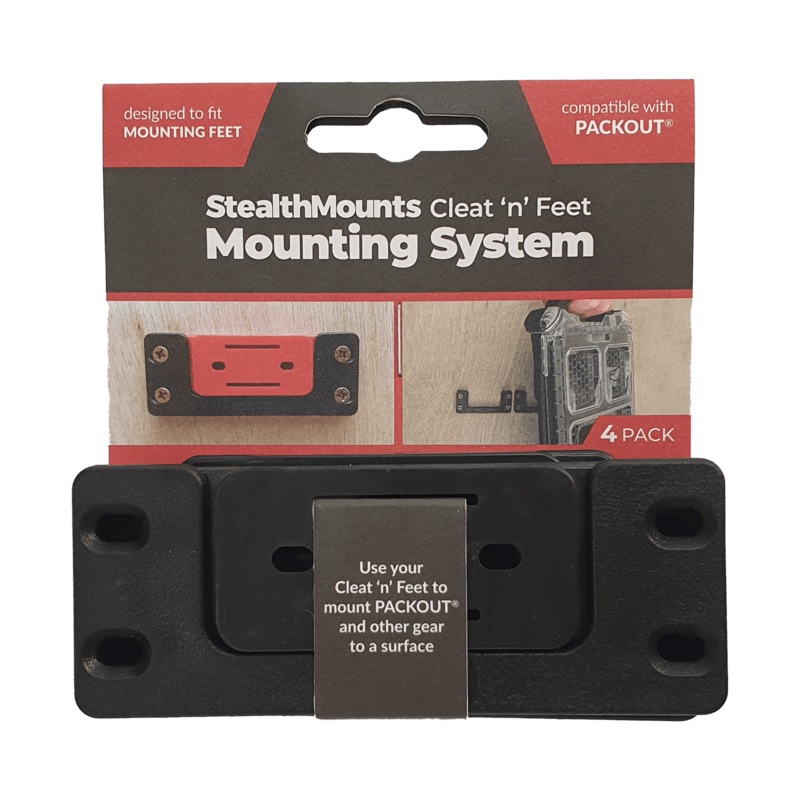 The StealthMounts Cleat ‘n’ Feet Mounting System comes with four Packout Feet and four cleats. The feet fit firmly into the cleats allowing the user to store nearly anything on almost any surface. The Packout Feet Slide in and out of the Cleats. The cleats are designed to be compatible with the Milwaukee Packout Mounting system, but the feet can be installed on any tool box or piece of equipment to allow for unique, new way to store your gear. Keep your gear off of the floor, and avoid clutter by storing your equipment and tool boxes in space that would otherwise be unused!