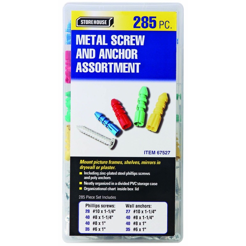 This assortment of metal screws and anchors includes zinc-plated steel Phillips screws and poly anchors to handle a variety of wall mounting options. These screws and anchors come organized in a divided PVC storage case with an included organizational chart for quick identification.