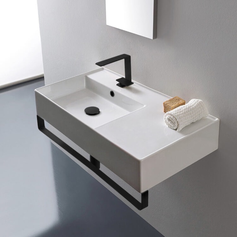 Perfect for the modern or contemporary bathroom atmosphere, this 32 inch bathroom sink is made from built-to-last white ceramic. It comes in the no hole, one hole, or three hole options and comes in wall mounted installation. Includes matte black towel bar. It was made in Italy by Scarabeo as part of their Teorema 2.0 collection. Ceramic sink is US and Canada standards approved (IAPMO, UPC/cUPC, ASME A112.19.2-2018/CSA B45.1-18).
