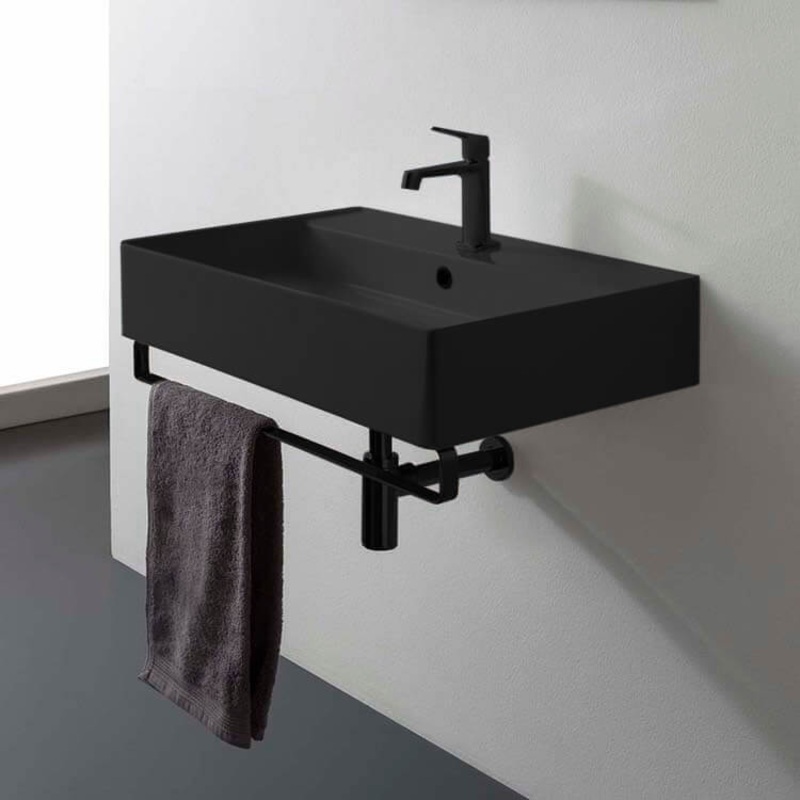 This wall mounted bathroom sink is crafted out of beautiful matte black ceramic and comes with an included matte black towel bar made out of high-quality brass. The rectangular design, with options for one, none, or three faucet holes and an included overf