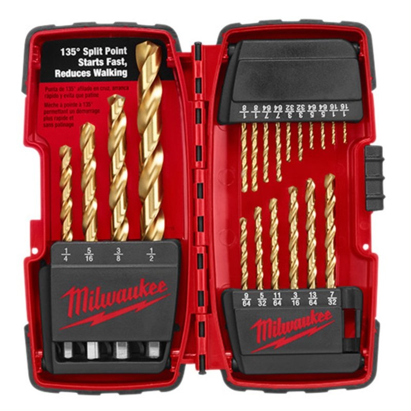 THUNDERBOLT Titanium Drill Bit Set – 20 pc, 3-Sided Shank, Includes: (1) THUNDERBOLT Titanium Coated 9/64″ Drill Bit (48-89-2206), (2) THUNDERBOLT Titanium Coated 7/64″ Drill Bits (48-89-2204), (1) 7/32″ Thunderbolt Titanium Coated Drill Bit (48-89-2211), (2) THUNDERBOLT Titanium Coated 5/64″ Drill Bit (48-89-2202), (1) THUNDERBOLT Titanium Coated 5/32″ Drill Bit (48-89-2207), (1) 5/16″ Thunderbolt Titanium Coated Drill Bit (48-89-2217), (1) 3/8″ Thunderbolt Titanium Coated Drill Bit (48-89-2221), (2) THUNDERBOLT Titanium 3/32″ Drill Bits (48-89-2203), (1) 3/16″ Thunderbolt Titanium Coated Drill Bit (48-89-2209), (1) 13/64″ Thunderbolt Titanium Coated Drill Bit (48-89-2210), (1) 11/64″ Thunderbolt Titanium Coated Drill Bit (48-89-2208), (2) THUNDERBOLT Titanium Coated 1/8″ Drill Bits (48-89-2205), (1) 1/4″ Thunderbolt Titanium Coated Drill Bit (48-89-2213), (1) 1/2 Milwaukee Thunderbolt Titanium Coated Drill Bit (48-89-2229) & (2) THUNDERBOLT Titanium Coated 1/16″ Drill Bit (48-89-2201)