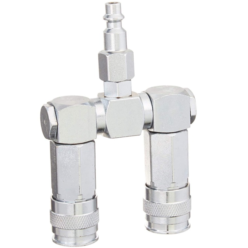 Splits (1) 1/4 air line into (2) 1/4 outputsAllows connection of (2) tools to a single outlet360 Swivel feature reduces kinks in hose